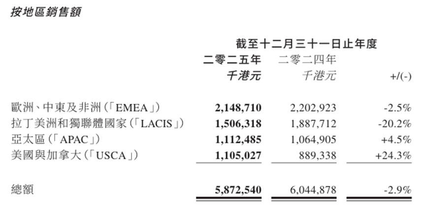 从区域市场方面,北美市场成为最大增长引擎,2025年北美地区(usca)实现收入超11亿港元,较2024年的不足9亿港元同比增长24.3%,创下年度收入新高。但另一方面,2025年百富在拉丁美洲和独联体国家(lacis)营收也暴跌超20%至15亿港元左右。欧洲、中东及非洲地区(emea)作为公司最大收入来源,2025年实现收入虽然超过21亿港元,但同比下降2.5%。
